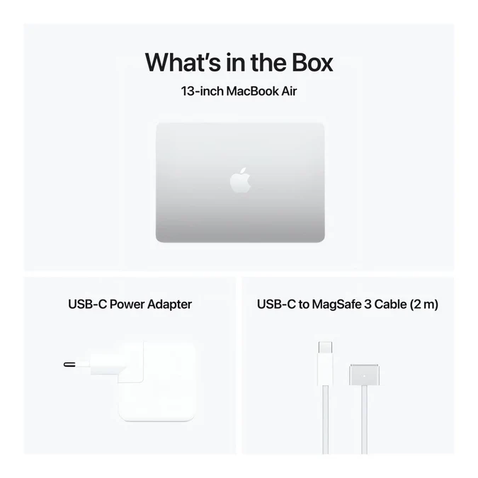 MacBook Air 13″. Lean. Mean. M3 machine. The M3 chip brings even greater capabilities to the super-portable 13-inch MacBook Air. With up to 18 hours of battery life, you can take it anywhere and blaze through work and play. macbook_air_13_in_m3_starlight_pdp_image_position_8__wwen_4.jpg (1200×1200) Key Features Lean. Mean. M3 Machine The blazing-fast MacBook Air with the M3 chip is a super-portable laptop that sails through work and play. Portable Design Lightweight and just over 11 millimetres thin, so you can take MacBook Air anywhere you go. Get More Done Faster The powerful 8-core CPU and up to 10-core GPU of the Apple M3 chip keep things running smoothly. Up to 18 hours of battery life Amazing, all-day battery life so you can leave the power adapter at home. macbook_air_13_in_m3_space_gray_pdp_image_position_4__wwen_1_2.jpg (1200×1200) A Brilliant Display The 13.6-inch Liquid Retina display supports one billion colours. Look Sharp, Sound Great Everything looks and sounds amazing with a 1080p HD camera, three mics, and four speakers with Spatial Audio. macbook_air_13_in_m3_starlight_pdp_image_position_6__wwen_4.jpg (1200×1200) Apps Fly with Apple Silicon All your favourites, from Microsoft 365 to Adobe Creative Cloud, run lightning fast in macOS. Get Connected MacBook Air features two Thunderbolt ports, a headphone jack, Wi-Fi 6E, Bluetooth 5.3 and a MagSafe charging port and connect up to two external displays with the laptop lid closed. If You Love iPhone, You'll Love Mac MacBook Air works like magic with your other Apple devices. Start an email on your iPhone and finish it on your Mac. Send text messages from your Mac and much more. Technical Specification Product: Apple MacBook Air 13 Operating system installed: macOS Sonoma Product colour: Silver Product type: Laptop Form factor: Clamshell Processor family: Apple M Processor model: M3 (8-Core CPU with 4 performance cores and 4 efficiency cores) Display diagonal: (34.5 cm) 13.6" Display resolution: 2560 x 1664 pixels Display: Liquid Retina, LED-backlit display with IPS technology, 500 nits brightness Internal memory: 24 GB unified memory Total storage capacity: 512 GB Storage media: SSD On-board graphics card model: 10-core GPU Hardware-accelerated ray tracing 16-core Neural Engine 100GB/s memory bandwidth Weight: 1.24 kg Connection and Ports MagSafe 3 charging port 3.5 mm headphone jack Two Thunderbolt / USB 4 ports with support for: Charging, DisplayPort, Thunderbolt 3 (up to 40Gb/s), USB 4 (up to 40Gb/s) In The Box 13-inch MacBook Air 30W USB-C Power Adapter USB-C to MagSafe 3 Cable