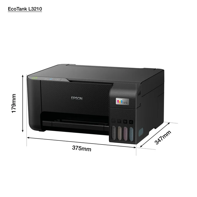 Epson EcoTank L3210 A4 Multifunction Colour Inkjet Printer With no cartridges to replace, this is the perfect multifunction (print-scan-copy) printer for anyone looking for high-quality prints at an incredibly low cost per page. Featuring a 100-sheet rear paper tray, borderless photo printing (up to 10x15cm) and print speeds of up to 10 pages per minute, you can speed through a variety of tasks with ease..